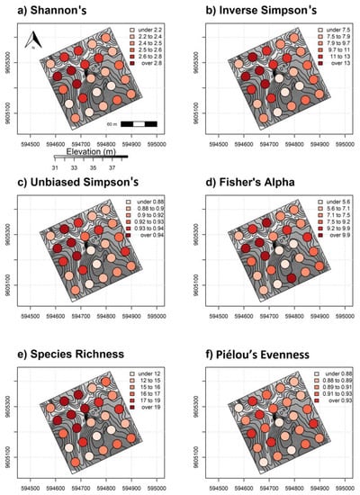 Regularly spaced 0.10 ha validation plots colored by α-diversity values (a) Shannon’s H′, (b) inverse Simpson’s, (c) unbiased Simpson’s, (d) Fisher’s alpha, (e) species richness and (f) Piélou’s J (evenness) overlaying elevation data and 3 m contours. High to low elevation is represented by dark gray to lighter background colors, respectively.