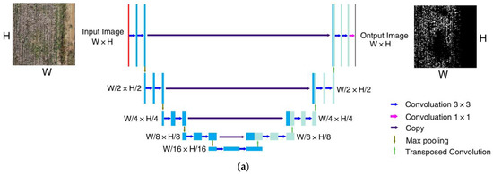 In this study, an ENVI deep learning module is used to extract cotton peach pixels from remote sensing images, with the feature extraction part based on a U-Net network model (Figure 6a). Before convolution, pixels with a value of 0 are usually filled around the image to ensure the same size before and after convolution; however, as the number of model layers increases, the degree of feature map abstraction increases, and the error will continue to accumulate. A U-Net model will not perform this operation, which will make it difficult to restore the original resolution of the image. The “overlap tile” scheme is used to reflect and fill pixels at the edge of the image to solve this problem (Figure 6b). This method preserves the context information of edge features while maintaining the original resolution of the image.