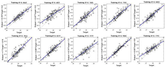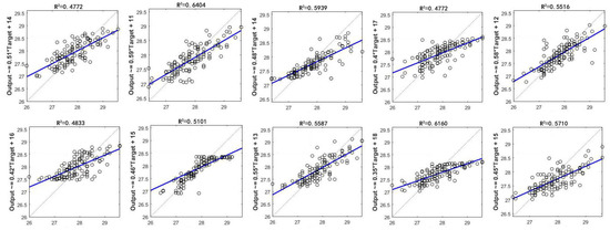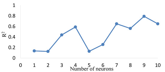 The hyperparameters of the neural network (such as the number of hidden layers and the number of neurons contained in each hidden layer) need to be set before training. In general, the two-layer network and linear output neurons with sigmoid activation functions can fit well the multi-dimensional mapping problem given a certain amount of data. For more hidden neurons and layers, the model’s performance has increased in the training set but decreased in the test set. This study uses a trial-and-error method to determine the number of neurons in the hidden layer. Figure 14 shows the R2 for the different network structures.