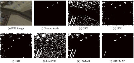 For the AVIRIS-II dataset, the color detection maps of different methods are presented in Figure 8. The locations of the three airplanes can be detected accurately by the proposed RRXEMAP method. The locations and shapes of two airplanes can be also detected fairly clearly. The LRX, CRD and LRaSMD detectors fail to detect the anomalies in this scene. The GRX and LSMAD detectors can detect the locations of the three airplanes, while they mistakenly identify some background pixels as anomalies. Figure 9 shows the ROC curves of these detectors and their corresponding AUC values. It can be seen that the ROC curve of the RRXEMAP method is much closer to the top-left corner than the others, and the corresponding AUC value is , which is larger than the others.
