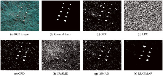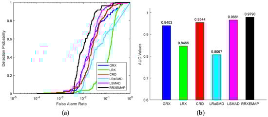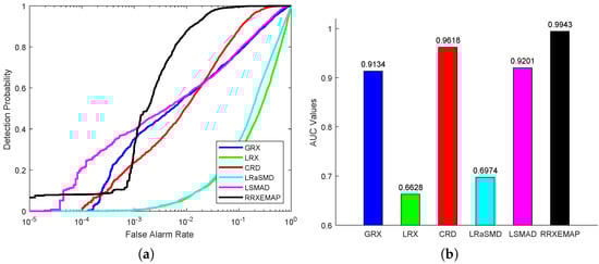 For the Cri dataset, the color detection maps of different methods are presented in Figure 10. All the detectors (GRX, LRX, CRD, LRaSMD, LSMAD and RRXEMAP) can detect the locations and shapes of the rocks, while the others (GRX, LRX, CRD, LRaSMD and LSMAD) mistakenly identify many background pixels as anomalies. Only the RRXEMAP detector can obtain a cleaner background. Figure 11a shows that the ROC curves of the RRXEMAP method are much closer to the top-left corner than the others in most situations. The AUC value of the proposed RRXEMAP method reaches in Figure 11b, which is higher than the GRX algorithm.