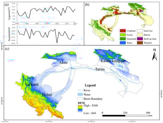 Overview map of the TRB (No. GS(2020)4619).(a) Changes in average annual temperature and precipitation in the TRB from 1990 to 2020; (b) Distribution of land use types in the TRB; (c) Topography and distribution of rivers in the TRB.