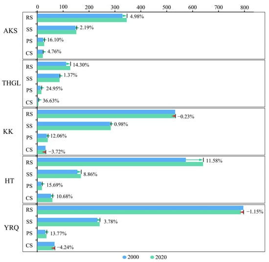 During the study period, 13,935.56 km2 of barren land was converted to grassland, among which YRQ had the largest area (4017.74 km2), HT had the second-largest area (3397.44 km2), and AKS and THGL followed with 2198.79 km2 and 2184.62 km2, respectively. Meanwhile, KK’s transformation area was the smallest (2136.95 km2). The conversion of 2475.82 km2 from a barren area to a water area mainly occurred in YRQ and HT, and the conversion area occupied 29.88% and 38.24% of the total conversion area, individually. From 2000 to 2020, 7248.39 km2 and 2091.20 km2 of grassland and water area were converted to barren land, respectively, and the ESV lost CNY 27.228 billion. The area of YRQ grassland converted to barren land was 1781.20 km2, and the conversion area of KK (1548.87 km2) was second only to YRQ. Overall, the modification area of AKS, HT and THGL accounted for 21.56%, 16.59% and 15.90% of the all transformed area, individually. The conversion of water to barren land mainly occurred in YRQ and KK, which converted 1026.63 km2 and 546.67 km2, respectively.