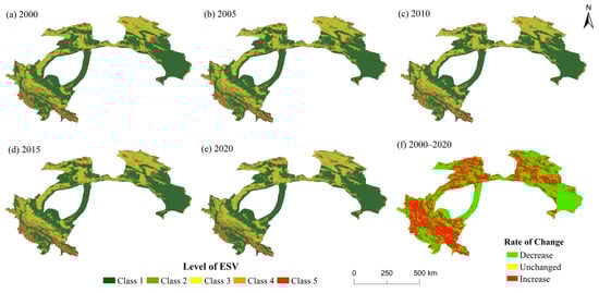 Changes in ESV distribution in the TRB during 2000–2020. (a–e) show the spatial distribution characteristics of ESV classes every five years, while (f) shows the change characteristics of ESV. (Class 1: CNY 0–4,135,360; Class 2: CNY 4,135,360.1–9,949,044; Class 3: CNY 9,949,044.1–24,183,096; Class 4: CNY 24,183,096.1–49,677,401; Class 5: CNY 49,677,401.1–91,347,521).