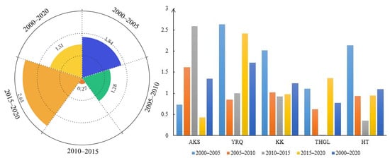 Climate change has increased snow and ice meltwater in the TRB. When the meltwater is combined with precipitation in the southern mountain region, the water and heat requirements necessary for the survival of natural plants in the area can be fully satisfied and the ecosystem service function can be strengthened. The significant causes of the change trend in this region are that the water area in 2020 showed a large decrease compared with that in 2015. Most of the lost water area was transformed into barren land, and the ecosystem service function was completely lost. Some of the water was converted into grassland and cropland, and the ecosystem service function declined. Compared with 2000–2005 and 2015–2020, the average elasticity values of AKS during 2005–2010 and 2010–2015 were higher, mainly because the areas of cropland, forestland, grassland and water with the strong ecosystem service capacity of AKS showed an increasing trend in 2010. Recent studies show that 2010 was a wet year in the TRB, giving the area abundant precipitation [43]. The special geographical location of AKS and the increase in glacier and snow meltwater led to the rapid growth of water area in 2005–2010. The area of grassland, forest and cropland also increased due to the increase in water resources. From 2010 to 2015, the decrease in precipitation, the reallocation of water resources, and the increase in water demand for agricultural development resulted in the continuous decline in water across the study region, resulting in a decline in the ESV.