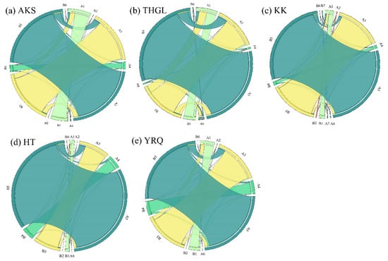 During 2000–2020, the interaction of HAI∩DEM (AKS: 0.887, THGL: 0.854, KK: 0.983, HT: 0.844, YRQ: 0.776) had the strongest influence on the heterogeneity of ESV. This is related to the high single-factor explanatory power of HAI and DEM in each sub-basin. The HAI∩TEM (AKS: 0.844, THGL: 0.850, KK: 0.848, HT: 0.670, YRQ: 0.600) and HAI∩PREC (AKS: 0.856, THGL: 0.849, KK: 0.852, HT: 0.700, YRQ: 0.619) were second only to HAI∩DEM in their spatial heterogeneity interference ability. By analyzing the interaction between natural factors, it can be seen that AKS, THGL, KK and HT DEM have the strongest interaction with PREC, followed by DEM and TEM. Furthermore, YRQ DEM has the strongest interaction with TEM, followed by DEM and PREC, while AKS and YRQ turn out to be nonlinear enhancement effects. THGL, KK and HT show a two-factor enhancement effect. Taking socio-economic factors as the starting point, HAI∩GDP (AKS, YRQ) and HAI∩PD (THGL, HT, KK) have the strongest interaction between factors, where AKS, THGL and KK show a momentous double factor heighten an effect, while HT and YRQ show a nonlinear enhancement effect.