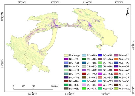 LUCC transfer in the TRB from 2000 to 2020 (CR: cropland; FO: forestland; GR: grassland; WA: water area; BA: barren; BL: construction land; WE: wetland).