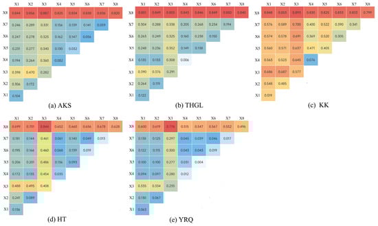 Factor interaction detection for ESV spatial differentiation. (figure (a–e): the two-factor interaction effects of each sub-basin in the study area; the color in the subplot tends to red for stronger correlation, and tends to blue for weaker correlation).