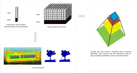 The octree data structure is used to store maps for flexible storage and application of map data and is a tree-like data structure used to describe a three-dimensional space. While the typical octree index structure will consume a lot of computing resources for spatial data queries, it is not suitable for real-time map matching. Therefore, considering the sparse characteristic of the point cloud, we simplify the index structure of voxels for quick queries. Specifically, we first divide and calculate the index items according to the ground plane in the horizontal direction, which are stored in a planar quadtree; thus, we can quickly query and locate the position of the planar voxel through the planar quadtree; after location to the planar quadnode, we divide and calculate the linear index along the elevation direction (Z axis direction), which are stored in a linked list structure. Each voxel only stores the occupancy probability information; in fact, each voxel can be further expanded to store more information, such as light intensity, semantics, and other information. In addition, the quadtree structure allows us to obtain multiple resolution maps by limiting the depth of the querying; thus, we can achieve coarse-to-fine matching in the scan-to-map matching stage. The high-precision voxel map model based on a planar quadtree and elevation index is shown in Figure 1.
