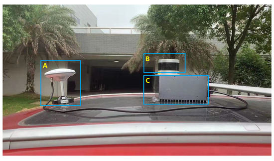 The MMS built in this paper integrates LiDAR, GNSS, IMU, and the Raspberry Pi operating system, which can be controlled by a mobile phone. (A) is a GNSS antenna; (B) is a VLP-16 LiDAR; (C) is internally integrated with the Raspberry Pi operating system, IMU, and GNSS board.
