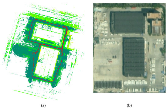 We first conducted experiments in industrial parks and on urban roads. The two-way smoothing trajectory of the GNSS RTK/INS integrated navigation was utilized to split multiple frames of continuous point clouds into a point cloud map. Firstly, we collected a set of synchronized GNSS, IMU, and LiDAR data to generate the pre-built EQT HD map, in which we manually removed dynamic objects so that only static objects remained on the map. The pre-built EQT maps and experimental site environments are shown in Figure 4 and Figure 5. The red line on the map is the reference trajectory provided by the GNSS RTK/INS smoothing integration algorithm. During the field test, the average speed of the vehicle was about 25km/h.