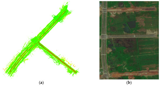 Test environment of road environment. (a) is the point cloud maps of road environment, the red line indicates the test route; (b) is the experimental site environments.