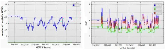 We used commercially integrated navigation software, GINS, to calculate the reference groundtruth. GINS can provide information such as the number of available satellites and dilution of precision (DOP) value, which indicate the quality of the GNSS observation environment. The number of available satellites and DOP values in the industrial park environment and the road environment are shown in Figure 6 and Figure 7. We can find that the number of available GNSS satellites in the industrial park environment is obviously less than that in the road environment, and the DOP value in the industrial park environment is obviously larger than that in the road environment. It shows that the observation conditions for GNSS in the road environment were obviously better than those in the industrial park environment.