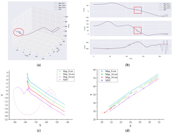 The positioning trajectories in the underground mine tunnel are shown in (a) of Figure 11, and the XYZ view is shown in b of Figure 11. The positioning trajectories based on the EQT maps of 8 cm, 16 cm, 24 cm resolution, and NDT trajectory are respectively marked as Traj_A, Traj_B, Traj_C, and Traj_NDT. It is obvious that Traj_NDT ends up in chaos, which indicates that the NDT algorithm failed at last. The trajectories inside the red ellipse in (a) of Figure 11 are enlarged and shown in (c) of Figure 11. As it can be seen from (b) of Figure 11, the differences between Traj_A, Traj_B, and Traj_C are very small except for the red box in (b) of Figure 11; the trajectories in the red box are enlarged and shown in (d) of Figure 11. It is obvious that the Traj_B and Traj_C were wrongly positioned, as the vehicle-mounted VLP-16 LiDAR was essentially moving at a constant speed during the field test. From (d) of Figure 11, we can also see that Traj_A was smoother than Traj_NDT. At the same time, we carefully checked the point cloud data used to build the map. The point cloud map in the NDT location failure part is complete, so the failed NDT algorithm trajectories are not related to defects in the construction of the map.