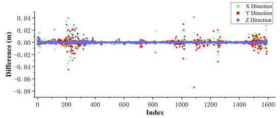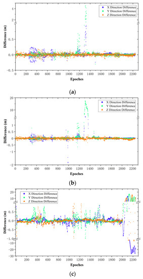 We further compared and analyzed the differences between Traj_A, Traj_B, Traj_C, and Traj_NDT in detail. Due to the complex environment under the mine, there is no groundtruth that can be referenced, so we take Traj_A as a reference for qualitative analysis because Traj_A was the smoothest of the four trajectories. The difference between Traj_A and Traj_B, Traj_A and Traj_C, and Traj_A and Traj_NDT in the same epoch is shown in Figure 12 for each. Among the differences between Traj_A and Traj_B in the X, Y, and Z directions, the percentages of difference less than 0.1 m are 93.6%, 96.4%, and 97.3%. Among the differences between Traj_A and Traj_C in the X, Y, and Z directions, the percentages of difference less than 0.1 m are 89.1%, 91.2%, and 90.2%. The biggest difference between Traj_A and Traj_B can reach 4.5 m in the Y direction, and the biggest difference between Traj_A and Traj_C can reach 17.5m in the Y direction. We can see from (a),(b) of Figure 12 that they were essentially in the same place. Although it is obvious that there is a large positioning error in Traj_B and Traj_C, we can see a convergence process in (a), (b) of Figure 12; it converged to the correct position through subsequent epochs. From one aspect, it reflects that our algorithm can tolerate large initial position errors in an underground mine tunnel environment. While among the differences between Traj_A and Traj_NDT in X, Y, and Z directions, the percentages of difference less than 0.1 m are 64.7%, 64.3%, and 71.2%. Traj_A and Traj_NDT have large errors in the last part because Traj_NDT was wrongly positioned at the end.