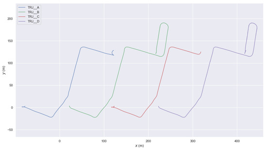 We conducted four data collections according to the mining route, including two complete routes from the ore loading point to the ore unloading point and two complete routes from the ore unloading point to the ore loading point. We used the EQT map with a resolution of 8 cm for vehicle positioning; the trajectories are shown in Figure 13. Although there is no groundtruth, we can see that our four trajectories were continuous and complete, which can prove the stability of our algorithm to a certain extent.