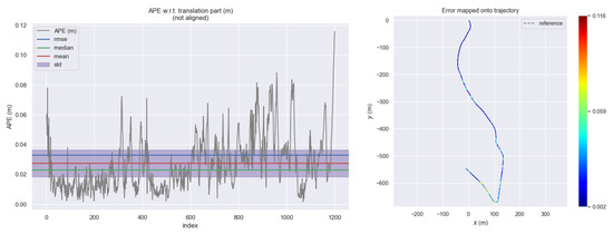 The KITTI dataset was jointly established by the Karlsruhe Institute of Technology in Germany and the Toyota American Institute of Technology. It is the world’s largest and most popular dataset for automatic driving and SLAM technology evaluation. First, we used the groundtruth provided by the KITTI dataset to splice all point cloud frames into a complete point cloud map and then used our method to generate an EQT map; all maps used 15 cm resolution. Then, we gave an initial pose to achieve continuous positioning of point cloud frames. The initial pose was based on the truth value, which added 0–20.0 cm of random error to the position and 0–1.0 degree of random error to the pose. Before the calculation, the point cloud of each frame was uniformly downsampled, and about 10,000 points were reserved for each frame. Then, we used the SLAM evo [40] tool to evaluate the absolute position error (APE) and count the error information. Evo is a trajectory evaluation tool for odometer and SLAM problems. Its core function is to be able to draw the groundtruth, or evaluate the error between the trajectory and the groundtruth in formats supporting multiple data sets. We counted the maximum, average, root mean square error (RMSE), and standard deviation (STD) of the absolute position error of each group of data sets, as well as the average time cost (ATC) of each frame; the results are shown in Table 10. It can be seen from Table 10 that most of the absolute positioning accuracy of our method is very high, achieving centimeter-level positioning.
