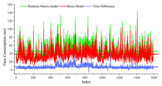 Compute time cost of using the Bursa model and rotation matrix model; the compute time difference between them is the blue line.