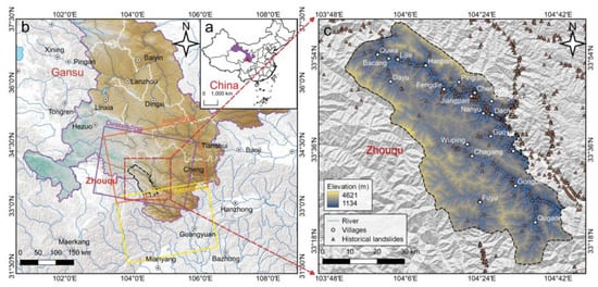 The study area, Zhouqu County, is located in the middle reaches of the Bailong River in the southern region of Gansu Province, northwestern China, with a length of approximately 99.4 km from east to the west and a width of approximately 88.8 km from north to south for a total area of approximately 3010 km2 and a latitude and longitude coordinate range of 103°51′39″E–104°45′31″E, 33°13′06″N–34°01′00″N, as shown in Figure 1. Zhouqu is located at the intersection area of the eastern edge of the Tibetan Plateau, the western flank of the Western Qinling Mountains, and the Minshan Mountain Range; this mountainous area has experienced extensive tectonics and erosion. The area is characterized by overlapping mountains, steep valleys, gullies, narrow valley channels, steep slopes, and rapid streams. The overall topography is high in the northwest and low in the southeast, with complex topography and large differences in elevation (Figure 1c); the area contains typical temperate monsoon zone alpine valley landforms [41]. Figure 1c shows the distribution of rivers in Zhouqu and historical landslides in Gansu Province. The rivers in Zhouqu belong to the Jialing River system in the Yangtze River basin, and the three main rivers are the Bailong River, Gongba River, and Boyu River. The historical landslide database was obtained from the Geographic Data Sharing Infrastructure, Resource and Environment Science and Data Center (http://www.resdc.cn accessed on 5 October 2022), and landslides have mainly been distributed in the northern and central areas of Zhouqu. Historically, frequent earthquakes around the area and human activities gradually intensifying with economic and social development have revived numerous ancient landslides in Zhouqu and caused extensive losses of life and property, with many new landslides [42].