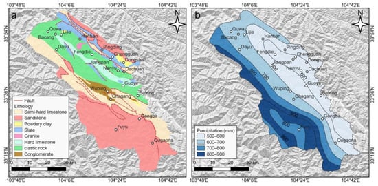 Figure 2. Geographic map (a) and average annual precipitation map (b) of Zhouqu County [43].