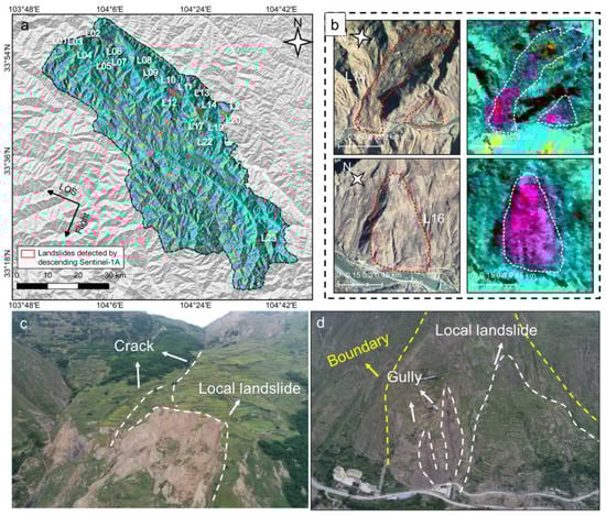 Figure 5. Stacking-InSAR landslide detection results based on descending data: (a) Stacking-InSAR phase results; (b) typical landslides; (c) distribution of cracks and local landslides of the L14 landslide; and (d) distribution of gullies and local landslides on the L16 landslide.