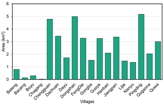 The landslides detected by InSAR technology were supplemented with the historical landslide database to obtain the latest landslide inventory map of Zhouqu. This map includes a total of 106 landslides with a total area of approximately 35 km2; the distribution of these landslides is shown in Figure 6. The yellow borders are landslides detected from the ascending SAR data (A), the red borders are landslides detected from the descending SAR data (D), and the purple borders are landslides in the historical landslide database not detected by InSAR technology (H). The distribution of the landslide area within each village in Zhouqu is shown in Figure 7, among which Pingding, Chengguan, and Dongshan landslides accounted for the highest percentages and Baleng, Bacang, Boyu, and Changang landslides in four villages were less distributed; other landslides accounted for a relatively high average percentage.