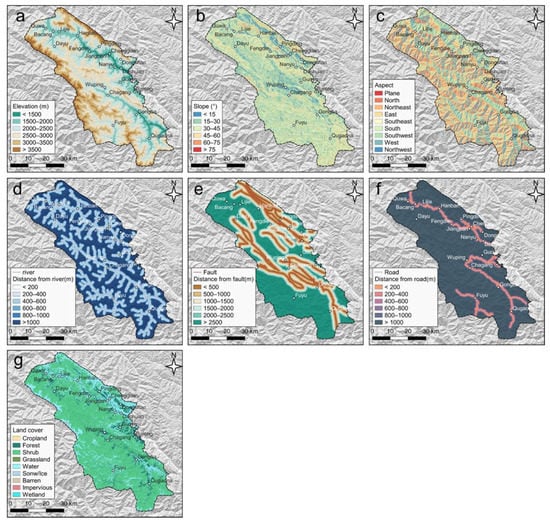 Figure 8. Landslide hazard factor classification in Zhouqu: (a) elevation; (b) slope; (c) aspect; (d) distance from river; (e) distance from fault; (f) distance from road; and (g) land cover.