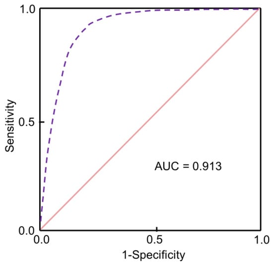In this paper, the CF value of each factor evaluation level was used as the input data of the model, and the susceptibility index (landslide: 1, nonlandslide: 0) was used as the output terminal of the model to perform susceptibility modeling. The landslide transcription data were randomly divided into two parts; 70% of the landslide sample units were used for model training, and the remaining 30% were used to verify the model performance. To avoid an imbalance in the model training process, the same amounts of data were randomly selected for the neural network analysis between the nonlandslide samples and landslide samples for susceptibility modeling. The results of the conventional hazard assessment are shown in Figure 9, and the natural interruption method was used to classify the susceptibility level. Among them, the high-susceptibility area accounts for 14.83% of the area of Zhouqu, and these regions are concentrated mainly in the northern and middle-eastern parts of Zhouqu. The medium-susceptibility area accounted for 10.37%, the low-susceptibility area accounted for 17.25%, and the very-low-susceptibility area accounted for 57.55%. The ROC curve (Figure 10) was used for the accuracy assessment; the area under the curve (AUC) was 0.913 > 0.5, and the accuracy of the training results was thus superior.