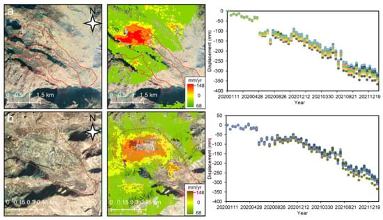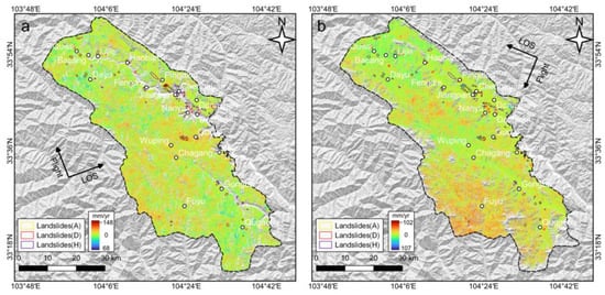 Figure 12. Deformation rate results (VLOS): (a) ascending SAR data deformation results and (b) descending SAR data deformation results.