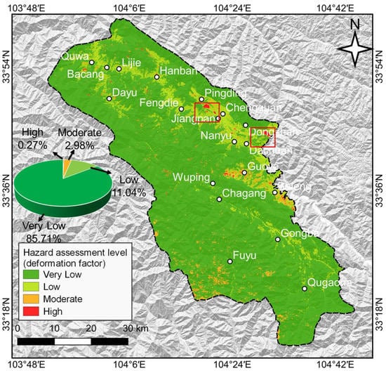 Based on Stacking-InSAR, the deformation rate results along the LOS direction for the whole Zhouqu area were obtained by using the SBAS-InSAR technique. To compare the deformation conditions of different slope directions and enrich the deformation information, the deformation rate in the LOS direction was projected to the steepest slope direction, and the results obtained from the ascending and descending data were combined with the matrix-based method to form the deformation rate level results of Zhouqu. The landslide hazard assessment levels considering the deformation factor of Zhouqu were obtained by combining those results with the landslide hazard assessment levels. Among the results, the medium-high-hazard areas accounted for 3.25% of the study area and had locations directly corresponding to the high-hazard Suoertou and Zhongpaicun landslides.