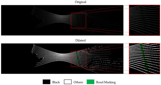 The intensity images were manually labeled into three classes to be used as training data for the CNN: ‘black’, which has no point cloud value, ‘road marking’, which is the target road marking, and ‘others’ which are all remaining pixels. A sample labeled image can be seen in Figure 4. These, along with the BEV intensity images, make up the training, validation, and testing datasets. Around 90% of all the processed images were used as training and validation data, which were further densified using the data augmentation method of multi-orientation flipping [20]. The remaining were used as testing data to assess the model performance in road marking extractions.