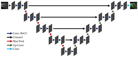U-Net is a CNN that was originally designed for biomedical image segmentation. Its structure, as seen in Figure 6, consists of a symmetrically connected succession of convolution layers with pooling operators in the first half and upscaling operators in the latter half for better and more precise predictions [21]. It is a popular CNN model that is now widely used in varying scientific fields, including the extraction of road markings from point cloud-derived images. It has also surpassed other CNN models in terms of accuracy by achieving the highest F1 score, reaching up to 90% in extracting road markings [10,11,12,13,16].