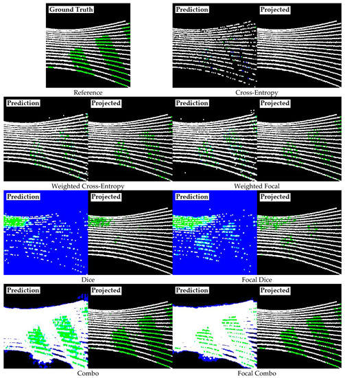 Figure 8 and Figure 9 show the sample cropped predictions of road marking extractions using our proposed loss function, focal combo loss, in comparison to other related existing loss functions using the U-Net and fast-SCNN models, respectively. Projected versions of the classified images are shown alongside them, with only those with corresponding point cloud values retained.