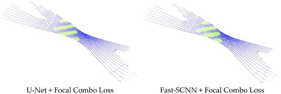 In addition, as mentioned in the overview of the methodology, in Figure 12 the extracted road markings can be combined with depth images to generate classified sparse point clouds as an extension. Figure 8 shows that this procedure can produce promising results for both CNN models trained with focal combo loss. However, it is clear that U-Net provides better geometry than fast-SCNN, but given that fast-SCNN has shown prediction speeds of 0.2 s, it shows potential for achieving real-time road marking extraction.