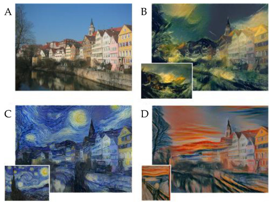 - Gatys, L.; Ecker, A.S.; Bethge, M. Texture synthesis using convolutional neural networks. Adv. Neural Inf. Process. Syst. 2015, 28, 262–270. [Google Scholar]