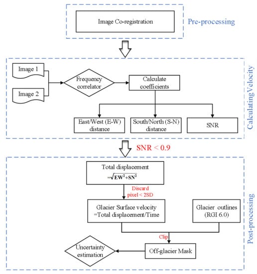 The glacier velocity was extracted as follows: (1) pre-processing consisted of image co-registration; (2) the glacier velocity was calculated using the Co-Registration of Optically Sensed Images and Correlation (COSI-Corr) framework []; and (3) post-processing including the analysis of the output from the second step. These steps are presented in Figure 2 and are described in the following sections.