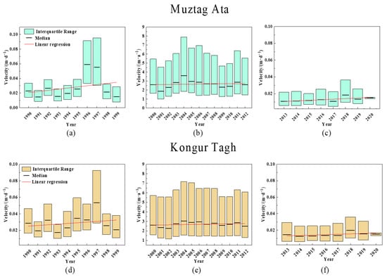 Figure 5 shows the median, quartile difference, and trend of glacier velocity in the Muztag-Kongur Mountains []. The median and quartiles provide information on the distribution and trends of glacier velocity. The glacier velocity in the Muztag and Kongur Mountains accelerated from 1990 to 1999 (the average increase was 4.79% and 6.35%, respectively). However, the glacier velocity showed a slight acceleration from 2000 to 2012 (the average increase was 1.44% and 0.87%, respectively). Interestingly, the glacier velocity accelerated rapidly from 2013 to 2020 (the average increase was 7.78% and 2.5%, respectively).