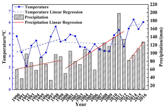 Inter-annual average air temperature and precipitation from 1990 to 2016 at the Taxkogan meteorological station.