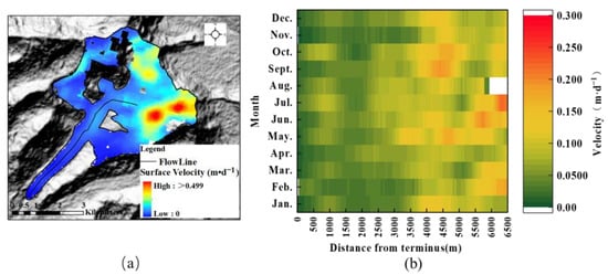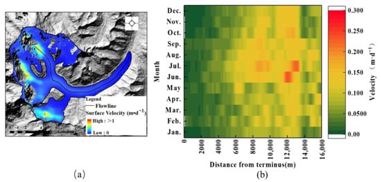 The high precipitation from May to September caused glacier mass accumulation. An increase in temperature in June and July resulted in glacier mass melting. The surface glacier velocity was the highest in June (figure in Section 4.4.2, 0.1836 m·d−1). However, the temperature and precipitation were high and low during July, respectively, decreasing the velocity (0.125 m·d−1).