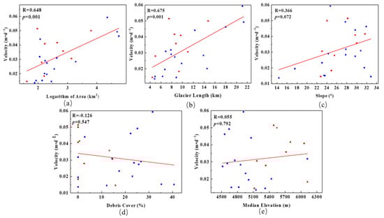 The results of linear regression analysis between glacier velocity and local morphological factors in the Muztag-Kongur Mountains: (a) logarithm of area; (b) length; (c) slope; (d) debris cover; (e) median elevation. The blue dots indicate glaciers on northern slopes, and the red dots indicate glaciers on southern slopes. R is the linear correlation coefficient between glacier velocity and local morphological factors, and p is the strength of the correlation.