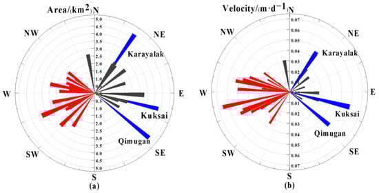 Glacier area and velocity in different slope directions: (a) area; (b) velocity. The red stripes represent glaciers on the western slope. The gray bands represent glaciers on the other slopes. The blue bands are the three largest glaciers in the Muztag-Kongur Mountains.