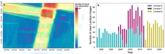The Sundarbans mangrove forests are intersected within the Landsat scenes 137–138/44–45 (paths/rows). The complete Landsat archive of Thematic Mapper (TM), Enhanced Thematic Mapper Plus (ETM+), and Operational Land Imager (OLI) images from January 1988 to December 2022 over the study region was acquired and processed on the Google Earth Engine (GEE) platform [24], yielding 2624 multi-band surface reflectance (SR) Landsat measurements, of which 1555 (59%) were considered to be useable (cloud cover < 30%) based on the quality assurance band provided by the CFmask algorithm [25]. Median composites were generated for each year to obtain cloud-free Landsat images and to fix our analysis on the relatively stable water level. Due to the sensor differences between ETM+ and OLI and sufficient observations of Landsat-8, only the Landsat-8 OLI images were used since 2013. The average cloud-free observations per year were 427, with a standard deviation of 155 (Figure 2a). Figure 2b shows the number of used Landsat observations for each year.