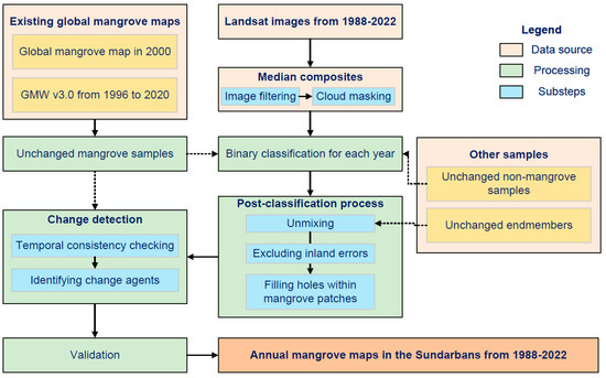 Here, our goal is to map and characterize changes in the Sundarbans mangrove forests from 1988 to 2022 at an annual scale. Specifically, we aimed: (1) to develop a new algorithm for tracking mangrove changes at an annual frequency by integrating classification differencing and spectral time-series anomaly detection, (2) to describe the spatio-temporal pattern of mangrove changes in the Sundarbans, and (3) to map the mangrove change agents and quantify their long-term trends.