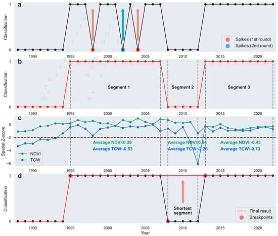Annual classification results corrected by TCC-CS over a selected site (latitude: 22.385418°N, longitude: 89.646424°E). Spikes in the (a) raw classification results were iteratively corrected first. (b) Temporal segments were then corrected by their (c) average z-score of NDVI and TCW, generating the black line in (d). Since the breakpoints were more than 2, the shortest segment was corrected to its opposite state. Eventually, a mangrove gain event was detected in 1995.
