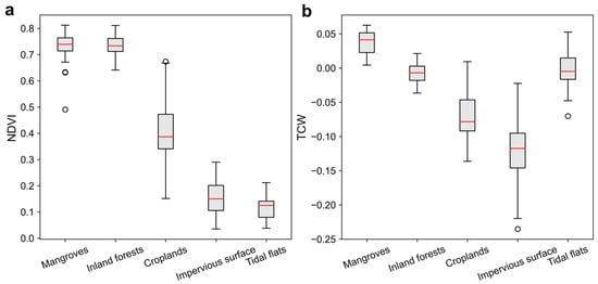 Figure 5. (a) NDVI and (b) TCW of five land-cover types. Boxes represent data within the 25th and 75th percentile, red lines show medians, and whiskers show 1.5× the interquartile range. Data points beyond that range (outliers) are shown as dots. Indices were collected from the Landsat-8 median composite in 2022. - Culling redundant breakpoints: In this case, 0.52% of the change pixels were detected to change more than twice after running the above correcting procedures. Since the transitions between mangrove and non-mangrove are unlikely to occur more than twice in a relatively short period, these breakpoints usually include false change events. For these trajectories with three breakpoints, the shortest temporal segment was corrected to the opposite state so that only one change was retained (Figure 4d). We observed that the pixels detected with more than three changes were almost all located at the edge of the mangroves (i.e., mixed pixels), mainly due to unstable classification results caused by similar vegetation and water percentages. These pixels were directly labeled as temporally stable (i.e., no real changes happened) and classified as the mode of annual classification results.