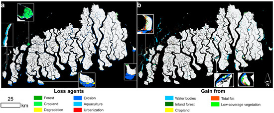 Change agent maps with some regional subsets. (a) Mangrove loss agents. (b) Land-cover types from which mangroves gained.