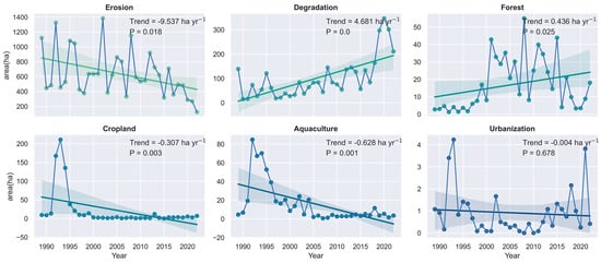 By overlaying the timing and agents of mangrove losses, we extracted the loss agent map to each year and calculated the area for each loss agent of each year to examine the temporal trend of each loss agent during 1989−2022 (1988 as the baseline) (Figure 9). While erosion was detected as the major agent of mangrove loss, we found they are significantly declining with a trend at −9.537 ha per year (Figure 9). Conversely, mangrove losses caused by degradation are increasing, with a sharp increase since 2018. Mangrove losses caused by inland forests are slightly increasing, mainly between 2000 and 2015. The losses of mangroves caused by cropland and aquaculture ponds show similar temporal trajectories, with the largest between 1990 and 2000 and declining in recent years. There was no significant trend and magnitude of mangrove losses caused by urbanization (p = 0.678), indicating that urbanization was not the main driver of mangrove losses in the Sundarbans.