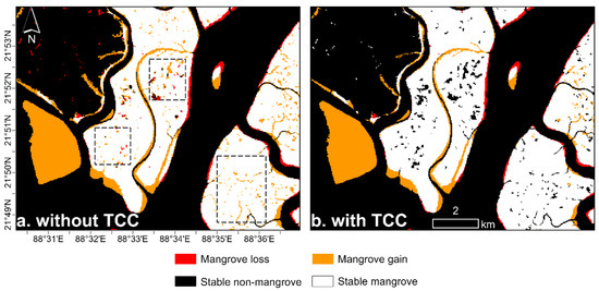 Change detection by simple classification differencing detected a lot of false changes due to classification errors in different years (Figure 10a). In contrast, TCC can improve the accuracy of change maps based on temporal textual information (Figure 10b). There are several contributions of the proposed TCC-CS approach for change detection. First, compared to previous TCC approaches [45,46], TCC-CS not only removes temporal spikes due to classification errors but also takes into account changes in greenness and wetness. Only multi-date classification differences with large deviations in greenness or wetness from mangrove samples would be considered true changes. This strategy could benefit change detection by correcting pixels that have been misclassified for consecutive years. Second, our approach can track the temporal trajectory of greenness and wetness with no need for serious calibration across sensors by using the spatial z-score. This avoids uncertainties of conventional NDVI thresholding methods [4,50] because NDVI changes can be caused by sensor replacement [51] (e.g., from Landsat TM/ETM+ to OLI) and drift [52] (e.g., MODIS). Another benefit of our approach is that mangrove changes can be detected without masking out high-tide observations. The reflectance of mangroves is highly impacted by water levels [16], and thus false changes can be detected when using images with different instantaneous tide levels. Previous approaches using high-frequency consecutive satellite observations may be invalid if consecutive high-tide observations occur. In contrast, our approach fixes the tide level to a median using annual composites, mitigating change errors caused by tidal fluctuations. Moreover, TCC-CS is computationally efficient because there is no need to fit regression lines to reconstruct spectral trajectories [53]. Given these potential advantages, the TCC-CS approach presented here allows the detection of land-cover changes in large regions.