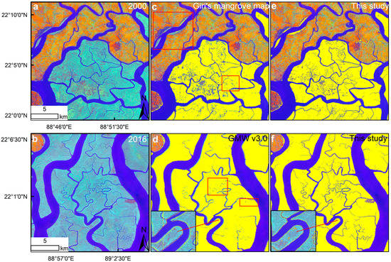 Visual comparison of this study to Giri’s mangrove map in 2000 and the GMW v3.0 in 2016. The left panels (a,b) show the false-color composite of the first three components of the tasseled cap transformation (R: Brightness component; G: Greenness component; B: Wetness component). The middle panels (c,d) indicate existing mangrove maps provided by Giri et al. [27] and GMW v3.0 [28]. The red boxes mark some obvious classification errors. The inset map in (d) illustrates the mismatch between the Landsat image and GMW v3.0. The right panels (e,f) show the mangrove area detected by this study. The yellow regions represent mangrove areas.