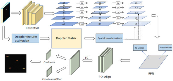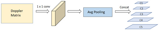 The fusion module firstly aligns the doppler domain feature matrix and its channel number with the last pyramid channel number using a 1 × 1 convolution. Then, for different feature map sizes of each layer, average pooling is used to spatially align them.